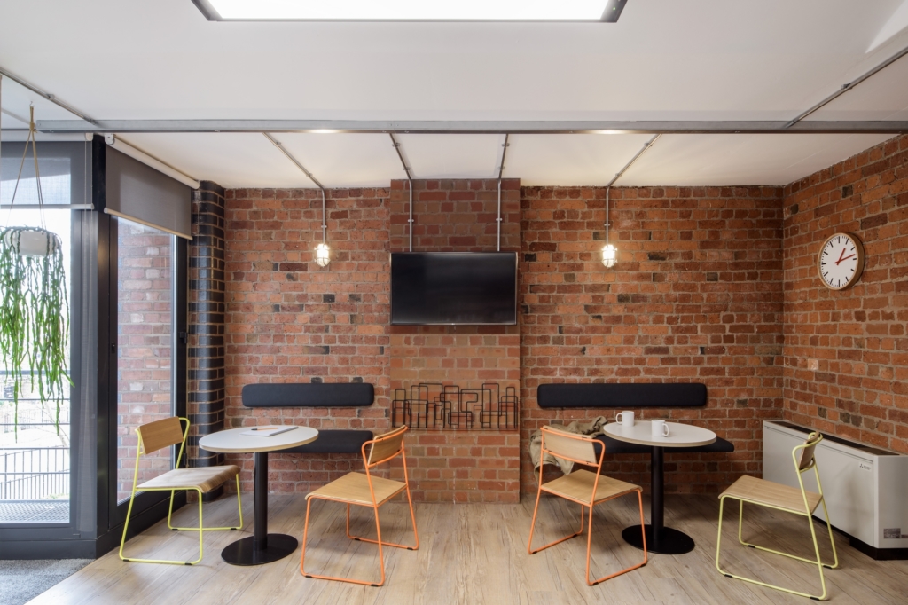 背景墻采用了樸素的磚塊來砌筑,從裸露紅磚到谷物提升機(jī)。我們的簡介是融入現(xiàn)代和豐富多彩的美學(xué),同時工作與歷史建筑的建筑和它的地方文化。瞬間帶人回到了鄉(xiāng)村氣息的感覺,幾個金屬置物架放上一些植物帶來大自然的泥土芬芳,仿佛讓人置身于大自然之中讓人心曠神怡,綠色本身就是放松眼睛的保護(hù)色,作為長期使用電腦的同事們是非常不錯的裝飾。
