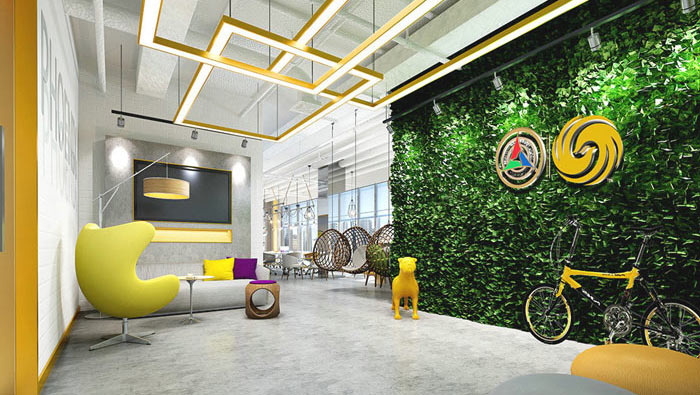 接待區(qū)域的設(shè)計:設(shè)計師在設(shè)計的時候,采用室內(nèi)與室外相結(jié)合的方式,此處的室外指的是對進門區(qū)域的合理運用,設(shè)計師通過軟裝對空間進行進一步的設(shè)計,一方面不影響整個空間的運行,另一方面為企業(yè)增加新的接待方式。