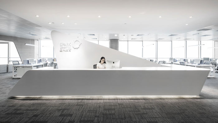 培訓(xùn)機構(gòu)辦公室前臺設(shè)計:前臺給人的感覺好像從天而降一般,這也是因為整個空間呈開放式分布,設(shè)計師為了避免整個空間一覽無余,故此選用造型新穎、別致的前臺,這樣的前臺除了承擔(dān)起接待的任務(wù),同時也要承擔(dān)阻隔的作用,在山尖處設(shè)計師將logo安置在此處,為企業(yè)的發(fā)展指明了方向。