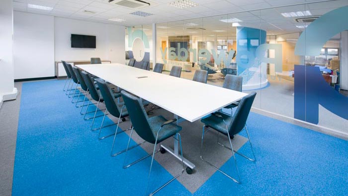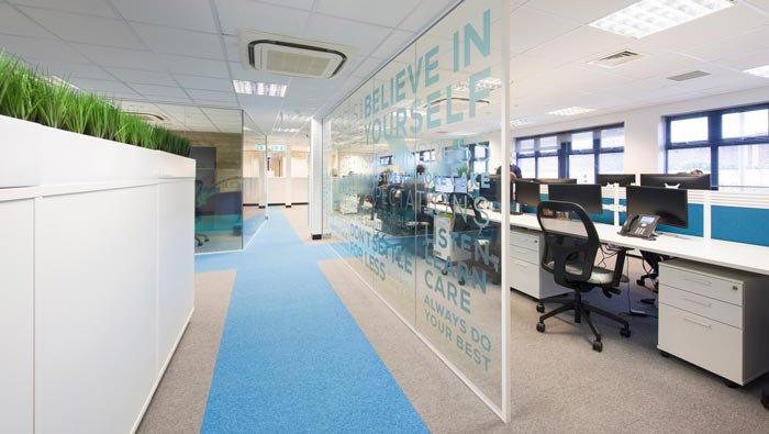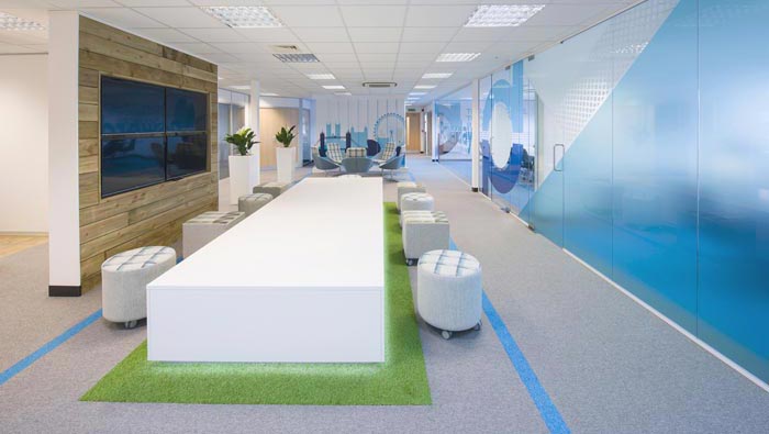 科技公司辦公室動線設(shè)計:設(shè)計師在設(shè)計的時候,動線大致分為十字進(jìn)行分布,這樣布局的原因就是空間格局是成一個個的小格子分布,故此采用十字形動線,在同時設(shè)計師為了圈定動線的安全區(qū)域,故此使用淺藍(lán)色地毯引導(dǎo)客戶與企業(yè)前行。