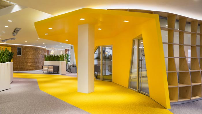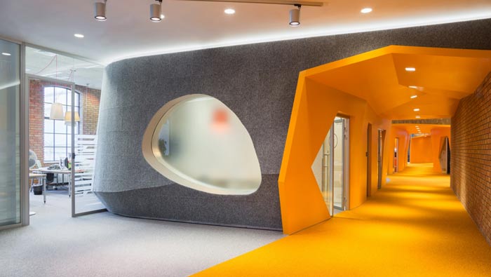 科技公司辦公室過道設(shè)計:橙色的過道設(shè)計,讓空間顯得十分夢幻,橙色是暖色系中最溫暖的顏色,它使人聯(lián)想到金色的秋天,豐碩的果實,是一種富足、快樂而幸福的顏色,寓意企業(yè)會讓客戶滿載而歸。