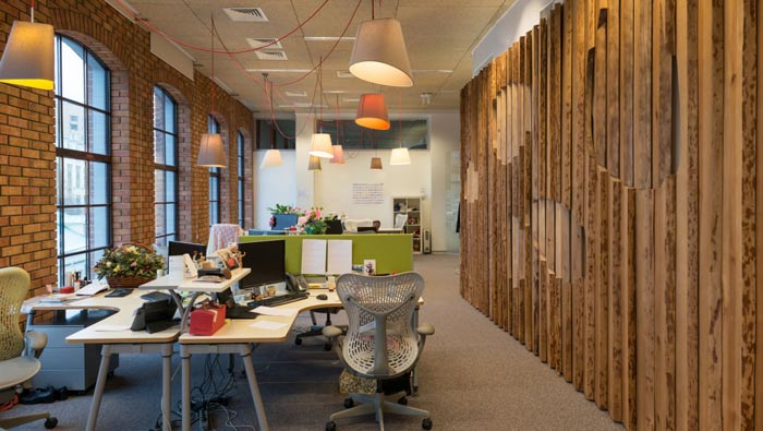 科技公司辦公室辦公區(qū)設(shè)計:此處有多種風格融合而成,設(shè)計師這樣做的目的,就是希望空間不會顯得過于單調(diào),紅磚讓人聯(lián)想到過去,各種設(shè)計造型定格于現(xiàn)在,木材隔斷預示著未來。