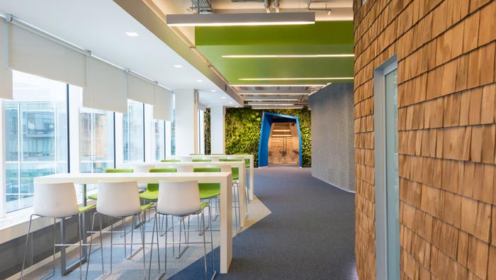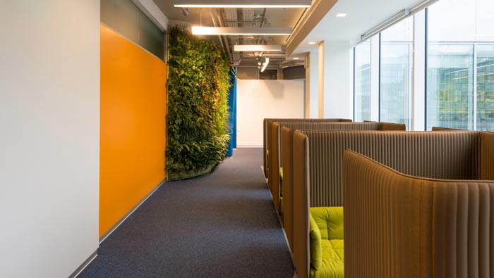 科技公司辦公室休息區(qū)設(shè)計:一排排座椅擺在空間的邊緣地區(qū),在這里員工可以休息、聊天、閱讀,想做什么都可以,設(shè)計師希望員工在這里可以忘記煩惱,哪怕只是片刻,片刻的輕松在如今真是千金難求。