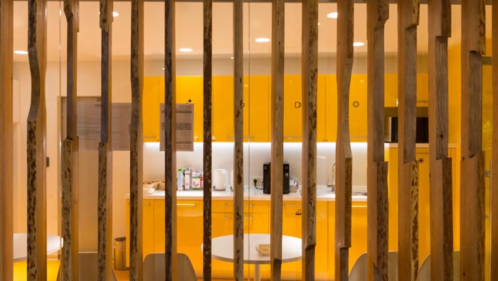科技公司辦公室茶水間設(shè)計:橙色做為暖色系,可以有效的治愈大家的疲勞,同時設(shè)計師為了避免空間顯得過于沉悶,故此設(shè)計師采用木隔斷,利用縫隙達到室內(nèi)、室外空氣的相互轉(zhuǎn)換,以此保證空間氣流的暢通。