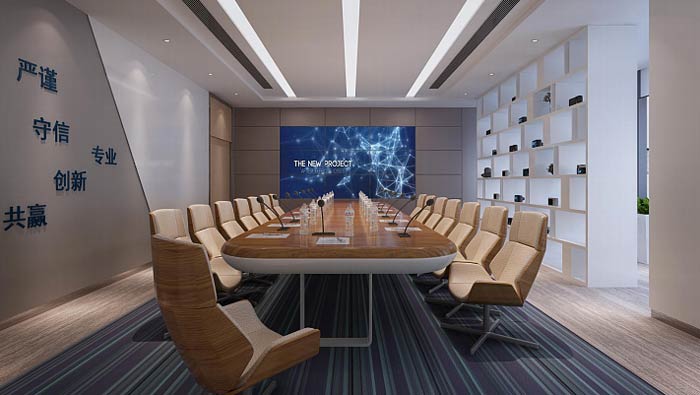 科技辦公室會議室設(shè)計:會議室簡潔、大氣的設(shè)計,更能滿足企業(yè)對于會議室的需求,墻面嚴謹、守信、專業(yè)、創(chuàng)新、共贏,體現(xiàn)了企業(yè)文化特征,咖啡色的會議桌彰顯高雅。