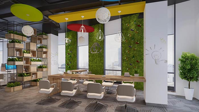 科技辦公室休閑區(qū)設(shè)計:休閑區(qū)采用簡單的造型、與色彩相互搭配,使的整個空間高效、嚴謹,休閑空間有休閑、辦公兩種屬性,綠植墻的出現(xiàn),是為了減輕長時間看電腦的視覺疲勞。