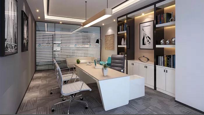 科技經(jīng)理辦公室設(shè)計:整個空間的設(shè)計關(guān)鍵詞就是簡約、時尚,色彩使用黑白灰三種色系,頂面做了簡單的石膏板裝飾,吊燈采用條文吊燈,整個空間的設(shè)計意在高效二字。
