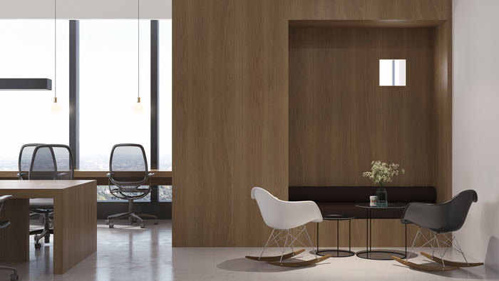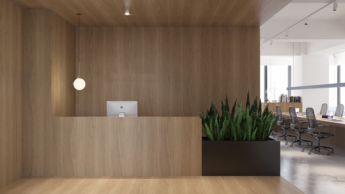 商貿(mào)公司辦公室前臺(tái)設(shè)計(jì):前臺(tái)的墻、頂、地全部由木材裝飾而成,這樣可以將前臺(tái)設(shè)計(jì)成一個(gè)整體,這樣的設(shè)計(jì)模式與企業(yè)的運(yùn)營(yíng)模式相同,一體化的設(shè)計(jì)提升了企業(yè)的專業(yè)度。