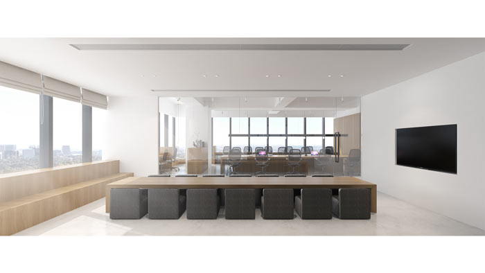 商貿(mào)公司辦公室會(huì)議室設(shè)計(jì):高坐有高坐的優(yōu)勢(shì)、低坐有低坐的優(yōu)勢(shì),在這里設(shè)計(jì)師接受了客戶的需求,將座位、座椅定制成低坐的模式,目的就是希望讓員工發(fā)現(xiàn)不一樣的世界。