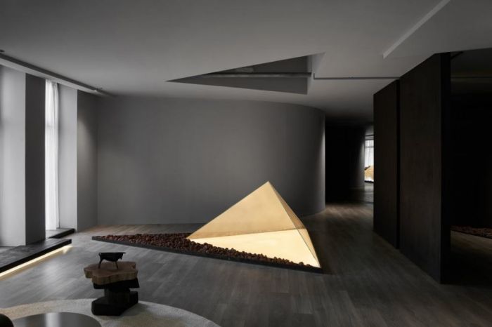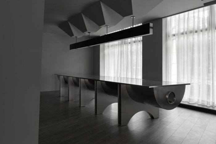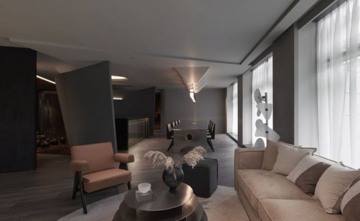 這是位于杭州公元大廈的國立酒業(yè)辦公會客廳的空間設(shè)計。空間結(jié)合了辦公和會客的功能需求,特別強調(diào)在白酒公司的工作環(huán)境中融入酒文化的精神需求。設(shè)計師從“酉”字的象形概念出發(fā),通過空間布局和形態(tài)學(xué)的應(yīng)用,創(chuàng)造了一種流動且富有層次的室內(nèi)環(huán)境,有效區(qū)分并聯(lián)系了公共會客廳和私密辦公區(qū)域。