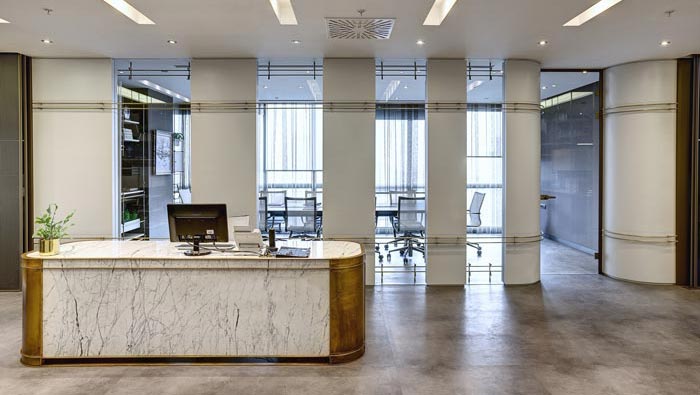前臺的設(shè)計:設(shè)計師在設(shè)計的時候,以進門區(qū)域的左側(cè)為準,將前臺設(shè)置在此處,目的就是讓客戶在進入空間后可以直接尋找到咨詢的人,同時企業(yè)logo鑲嵌在前臺的前方,讓客戶在第一時間即可以尋找到咨詢的人,也可以對企業(yè)的屬性有一個了解。