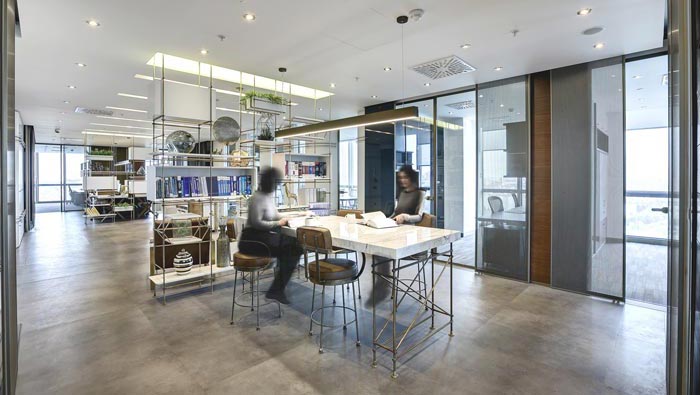 接待區(qū)域的設(shè)計:設(shè)計師在設(shè)計的時候,將其安置在動線的必經(jīng)之路上,在設(shè)計師看來這樣的設(shè)計可以起到很好的緩沖作用,同時設(shè)計師將儲藏架安置在接待區(qū)域的附近,以此提升接待空間的附加功能,讓客戶在此處等待的時候可以有事可做,了解企業(yè)的文化與以往的案例。