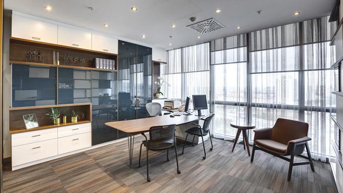 俯視整個總經(jīng)理辦公室的設(shè)計:可以看出整個空間在設(shè)計師的設(shè)計手法之下變得越發(fā)精致,每一處都宛若天成,每一處與每一處的配合都是那么的契合,當窗簾拉開的那一瞬間,陽光瞬間將整個空間照射的一覽無余,一覽無余的設(shè)計、功能齊全的設(shè)計,兩個看似矛盾的場景同時出現(xiàn)在一個空間,不得不讓人嘆服。