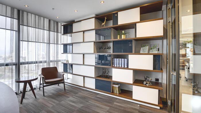 總經(jīng)理辦公室展示區(qū)域的設(shè)計:設(shè)計師在設(shè)計的時候,為了保證空間的完整性,故此在選擇展示柜的時候,重點在于色彩與造型之上進行甄選,在設(shè)計師看來展示柜不僅需要起到儲藏與展示作用,還需要與整個空間搭配,這樣的好處就是既保證了其實用性、也保證了其觀賞性。