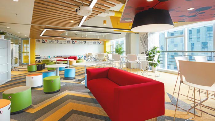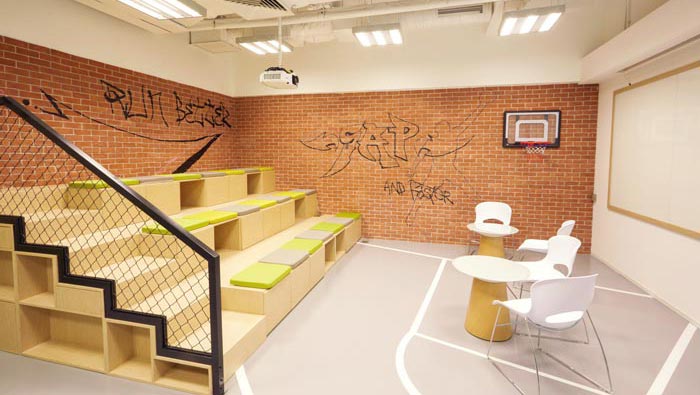 網(wǎng)絡(luò)公司辦公室休息區(qū)設(shè)計:設(shè)計師在設(shè)計的時候,將娛樂區(qū)域融入其中,設(shè)計師為了有效的提升空間的容納能力,特意將看臺復(fù)制在空間之中,讓員工在此次有一種身臨場地的感覺,在此地忘卻煩惱。