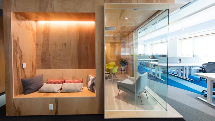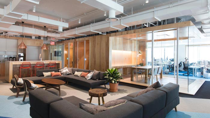 網(wǎng)絡(luò)公司辦公室茶水間設(shè)計:設(shè)計師在設(shè)計的時候,將其與休息區(qū)域相融合在一起,設(shè)計師希望員工可以在此處休息、交流、玩耍,光源透過透明隔斷射入室內(nèi)空間,暖洋洋的氣氛充斥整個空間。