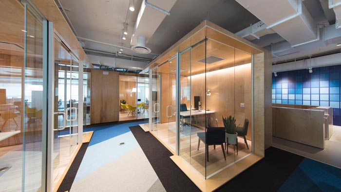 網(wǎng)絡(luò)公司辦公室動線設(shè)計:設(shè)計師在設(shè)計的時候,考慮到此處空間地處空間的內(nèi)側(cè),故此讓光源可以投入此處空間之中,動線的設(shè)計也采用不同的色彩進(jìn)行表現(xiàn),設(shè)計師希望通過這樣的設(shè)計增加空間的通暢與方便。