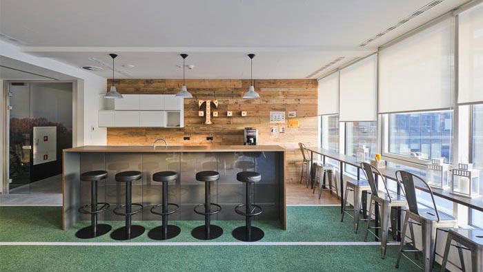 網(wǎng)絡(luò)公司辦公室茶水間設(shè)計(jì):設(shè)計(jì)師在設(shè)計(jì)的時(shí)候,將其安置在內(nèi)部空間與外部空間的連接點(diǎn),設(shè)計(jì)師希望此處做為一個(gè)過(guò)渡區(qū)域使用,讓內(nèi)外之間的變換不會(huì)過(guò)于明顯,讓客戶(hù)對(duì)空間的變化充滿(mǎn)期待。