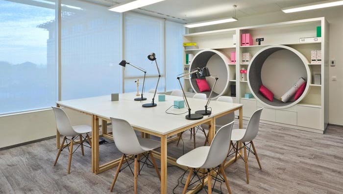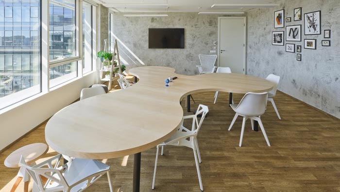 網(wǎng)絡(luò)公司辦公室辦公區(qū)設(shè)計(jì):此處的設(shè)計(jì)極為特別,一個(gè)魚(yú)星的設(shè)計(jì)占據(jù)了空間的絕大部分空間,同時(shí)辦公桌的每一個(gè)節(jié)點(diǎn)都是一個(gè)員工,即保證了員工之間的互動(dòng),同時(shí)也為員工保留了個(gè)人的空間,陽(yáng)光投射進(jìn)入空間,暖洋洋的氛圍讓員工在此處輕松、逾越的辦公。