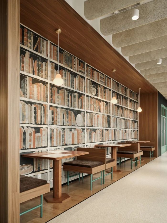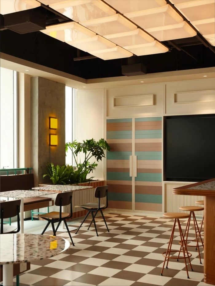 其次是精神補(bǔ)給的CULTURE(文學(xué))和INTEREST(興趣)層。文學(xué)層以“書頁”形式做了頂燈和壁燈設(shè)計(jì),柔和的燈光、墨綠的墻面宛若置身圖書館。興趣層的趣味性較強(qiáng),色彩也更溫馨明亮。