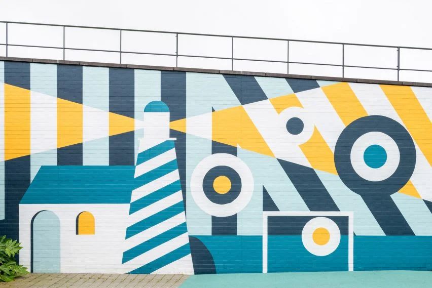 從簡(jiǎn)單的海上旗,上面寫(xiě)著電視房間里的單位名稱,一直到一幅有目標(biāo)和目標(biāo)的大型燈塔壁畫(huà),在中央花園里玩球。