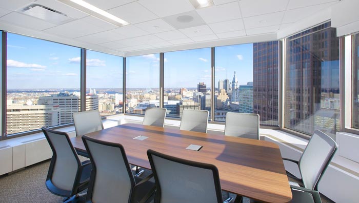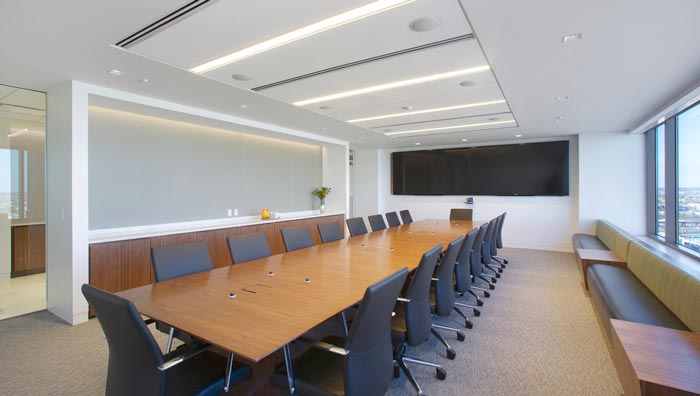 會議室的設(shè)計:加長版的會議桌豎著擺放在空間之中,基本的空間屬性依然形成,設(shè)計師要做的就是將空間的每一處空間,都得到合理的安置,沙發(fā)背靠墻體即增加了空間的容納能力,也沒有破壞整個空間的格局,反而為欣賞美景提供了平臺。