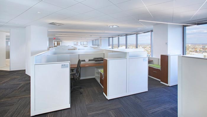 辦公區(qū)域的設(shè)計:此處也是開放、封閉的結(jié)合體,此處給人的第一感覺就是明亮、開放,每一個封閉的空間都是一個工位,但是此工位的設(shè)計也十分有講究,當員工起身就可以看到整個空間,讓人在立與坐看到的風(fēng)景是不同的,立看到的是一個開放的空間,讓人的心瞬間變得開朗起來,坐下來看到的是工作,讓人能夠瞬間進入工作的狀態(tài)。