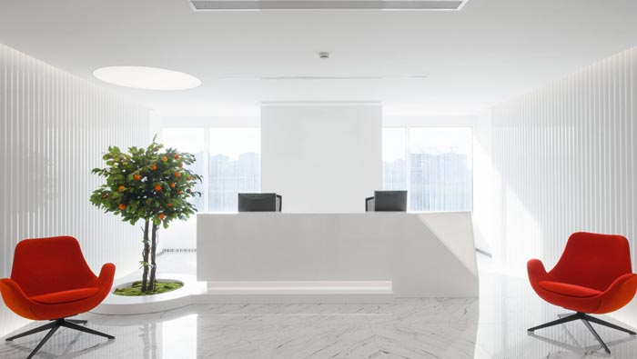 600平方辦公室前臺區(qū)設(shè)計:此處給人的第一感覺就是簡約、自然,眼光在設(shè)計師的設(shè)計手法之下,經(jīng)過多次折射后的柔光進(jìn)入室內(nèi),讓顧客進(jìn)入空間之后會感覺到身心暖洋洋的,而且此處會根據(jù)每天陽光的高度、強(qiáng)度進(jìn)行隨機(jī)變化,讓客戶每次到來都感受到不同的空間氛圍。