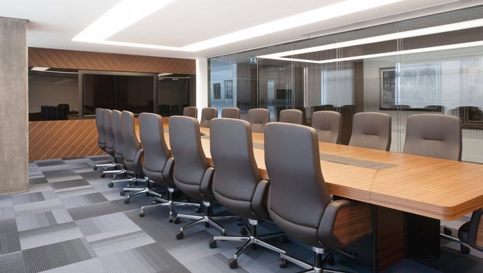 600平方辦公室會議室設(shè)計:此處的亮點就是在會議桌的選擇上面,會議桌給人的第一感覺就是厚重,這也正是設(shè)計師希望給大家?guī)淼膱鼍埃O(shè)計師希望通過這一抹厚重,讓人從煩躁中脫離,因為在設(shè)計師看來,事情的解決不是靠一時興起,而是需要一步一個腳印的走下去。