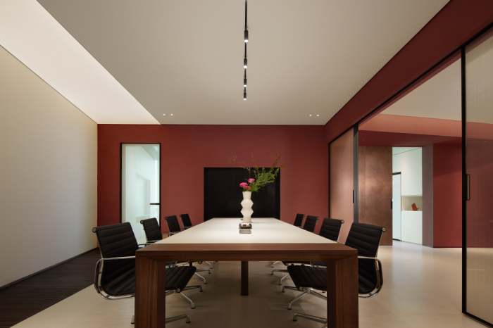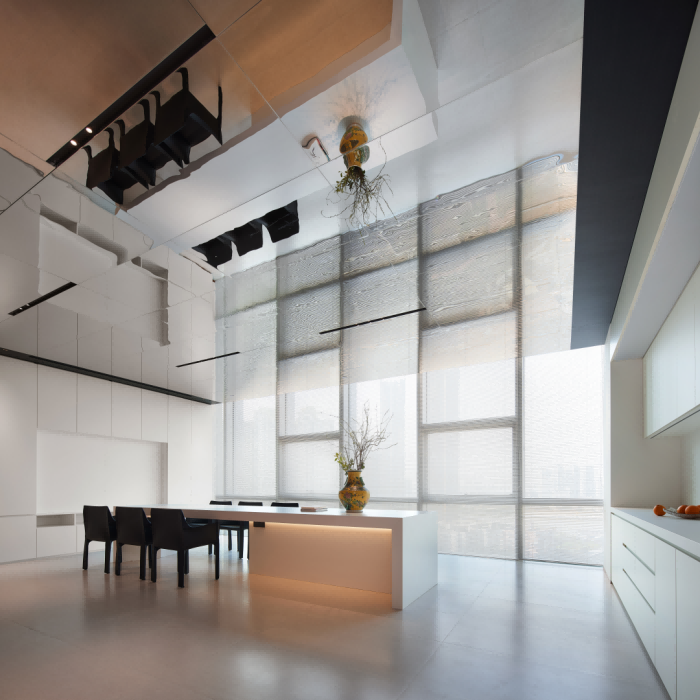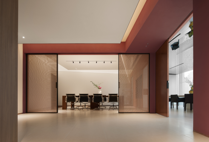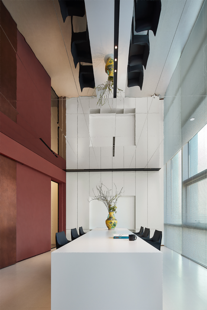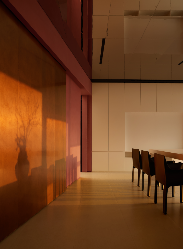 辦公室不同于尋常的辦公空間,以體驗(yàn)式的空間形態(tài)呈現(xiàn),情緒逐漸由外至內(nèi)轉(zhuǎn)變,變得安靜柔和。在感知層面,設(shè)計(jì)師通過設(shè)置明顯斜角和落地窗前的斑駁光波反射,增加空間的層次感和立體感。在視覺層面,設(shè)計(jì)師通過斜面的設(shè)置和不同材質(zhì)的運(yùn)用,改變空間的視覺效果,增添更多表現(xiàn)力和質(zhì)感。在敘事層面,設(shè)計(jì)師通過創(chuàng)造一個(gè)有趣的空間邏輯,將生活融入空間的細(xì)節(jié)中,讓使用者自主發(fā)現(xiàn)。