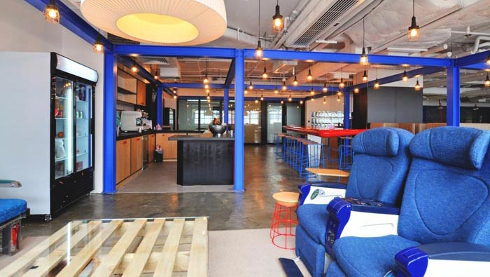 交流區(qū)域的設(shè)計(jì):此處主要是為了滿足思考與交流,在設(shè)計(jì)師看來(lái)創(chuàng)意不是你站在那里就可以想到的,而是需要不斷的嘗試,只有經(jīng)過(guò)不斷的嘗試才能夠抓住創(chuàng)意的尾巴,而此時(shí)也僅僅是觸碰到而已,這個(gè)時(shí)候絕對(duì)的放松十分重要,此處讓人忘卻外界繁雜,進(jìn)入自己的內(nèi)心世界不斷尋找、不斷突破。