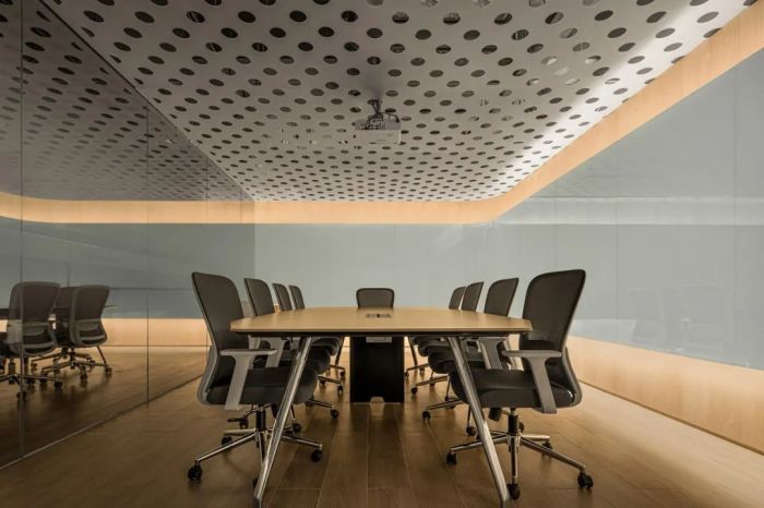 設計師受海水的啟發(fā)對每個樓層進行主題和色彩定義,采用不同色彩、材質和空間的組合,為員工創(chuàng)造輕松舒適的辦公環(huán)境。大堂作為企業(yè)形象的展示窗口和整個計劃公共屬性最強的樓層,采用聚焦中心的設計策略,將設計的重點聚焦在前臺區(qū)域。