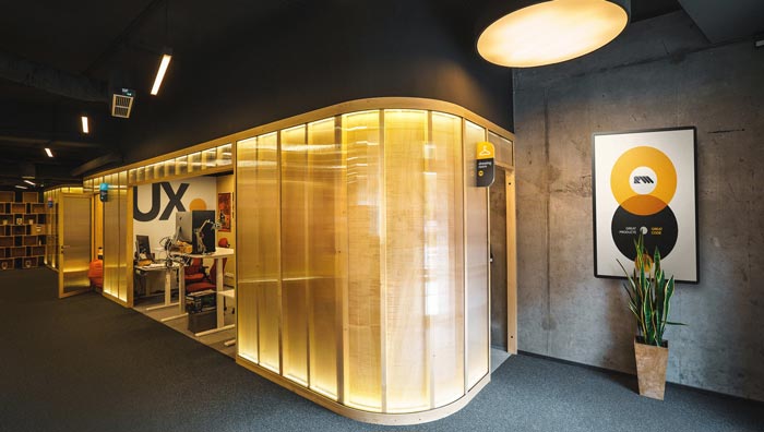 編碼室的設(shè)計(jì):內(nèi)外之間有一種別樣的感覺(jué),外部空間以暗色為主,內(nèi)部空間以暖色為主,兩種色彩相互結(jié)合在一起,卻給我們展現(xiàn)了神奇的一面,暗色的頂與過(guò)道給程序員營(yíng)造了一個(gè)絕對(duì)安靜的空間氛圍,暖色系讓空間更加的溫馨,這樣的搭配主要就是希望給程序員一種家的感覺(jué),消除程序員的煩躁與無(wú)聊。