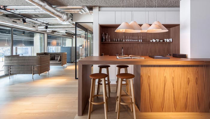吧臺的設計:設計師將吧臺與茶水間進行了有機的結合,其目的就是希望給空間更多的屬性,設計師要做的就是將每一個區(qū)域進行融合,在設計師看來由于空間的面積有限,故此在設計中一定要考慮到各個方面的融合,也只有如此才能將空間利用到最大化。