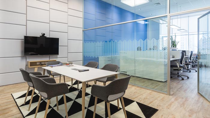 會議室的設(shè)計:此次位于辦公區(qū)域的一邊,這樣設(shè)計也是受到空間面積的限制,在玻璃隔斷上設(shè)計師采用了隔音玻璃,目的就是為了保證會議的正常運行,空間布局簡單、便捷,讓員工在這樣的空間中可以自由發(fā)揮,在設(shè)計師看來會議的開展正該如此。