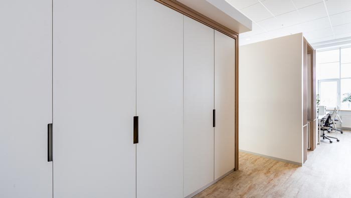 會議室推拉門的設(shè)計:此處是會議室的一處活動墻,設(shè)計師這樣設(shè)計的目的,就是希望空間可以相互連接在一起,當(dāng)會議開展之時,推拉門將空間形成一個獨立的空間,在平時不用的時候,可以將其打開,讓空間的效果可以發(fā)揮到最大化。