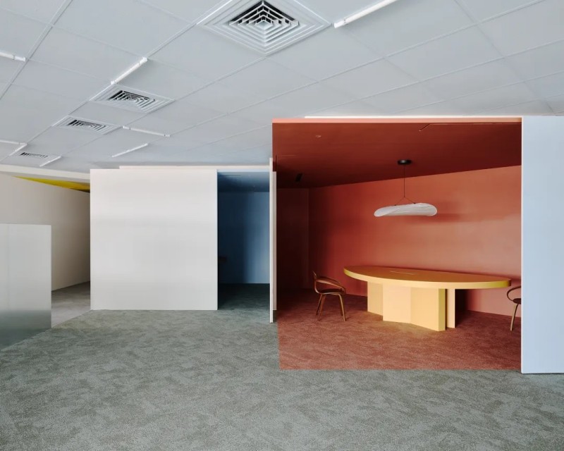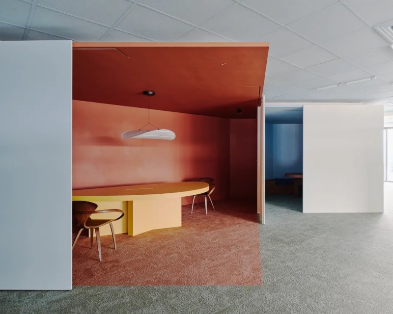 在假期國際的辦公空間設計邏輯中,設計師拋開辦公室點到點、格狀切割空間的形式,改以回繞、非定向的空間路線制造蜿蜒,讓使用者行走間對環(huán)境產生「探索」之感,而非傳統(tǒng)僅求效率、壓縮個體感受的工作環(huán)境。設計師希望透過回繞行走,即使座位至茶水間的片刻都能讓緊湊生活得到喘息節(jié)奏,如同自我療愈的儀式。