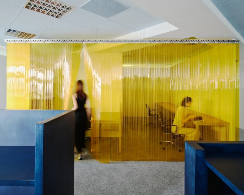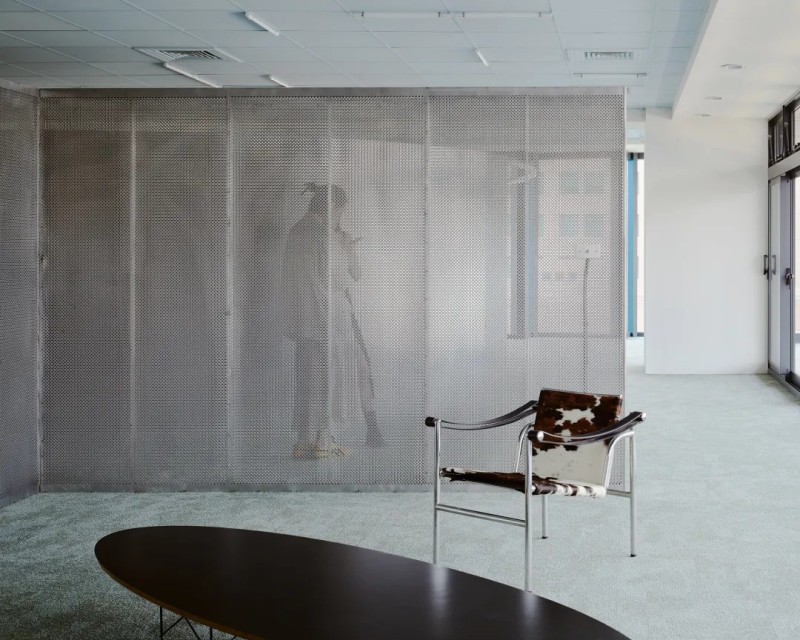 為此,設計師將入口臨窗西曬側設定為短暫停留的動線區(qū),讓工作位置脫開日曬范圍,別于傳統(tǒng)接待柜臺及等候區(qū)模組,我們設計幾座高背座椅建構這段過度空間,這些看似隨機的塊面如雕塑錯落于窗邊,比固定隔間更具靈活性,其造型易于控制屏蔽比重又能遮陽,訪客候位可于椅陰影乘涼,業(yè)主也能利用如墻形式配置品牌訊息。