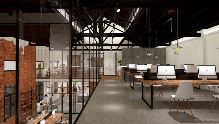 二樓辦公區(qū)域保留空間特點,斜面除了做了筒燈處理外,基本保持了原始模樣,外沿投射燈配合筒燈保證室內(nèi)晚間光照,提升室內(nèi)氛圍。