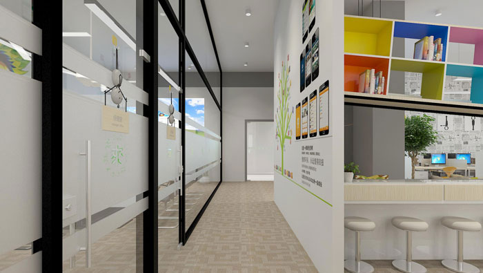過道的設(shè)計(jì),最大的亮點(diǎn)是——形象墻與玻璃隔斷的運(yùn)用,在此處的弊端就是過道會(huì)有緊促之感,設(shè)計(jì)師將形象墻與采用玻璃隔斷就是為了消除緊促之感,被形象前吸引,忽略環(huán)境的變化。