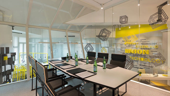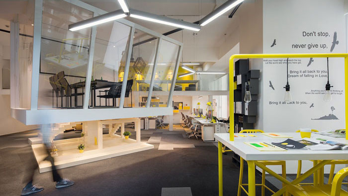 會(huì)議室的設(shè)計(jì),設(shè)計(jì)師將其安置在空間的中心,一則做為企業(yè)的亮點(diǎn)存在,二則懸空的空間給人以俯視的感覺(jué),本空間不論是內(nèi)部還是外部都攜帶創(chuàng)意的屬性,這樣的空間使人靈感無(wú)限。