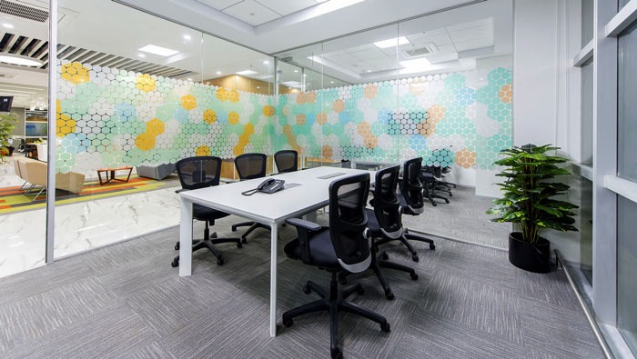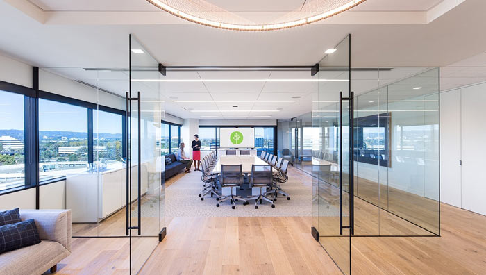 會(huì)議室裝修效果圖:會(huì)議室與辦公區(qū)域僅有一條動(dòng)線相隔,設(shè)計(jì)師這樣設(shè)計(jì)的目的,就是希望加緊企業(yè)內(nèi)部之間的互通互聯(lián),讓企業(yè)的流程與辦公更加便捷化。