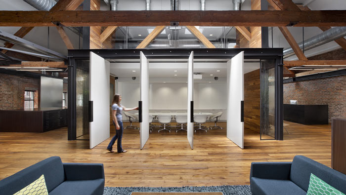 會(huì)議室裝修效果圖:此處會(huì)議室設(shè)計(jì)的亮點(diǎn)在于門的設(shè)計(jì),四扇門組成了空間的進(jìn)入與關(guān)閉,打開時(shí)四條通道連接室內(nèi),關(guān)閉時(shí)門與隔墻完美契合,展現(xiàn)了開與關(guān)的魅力。