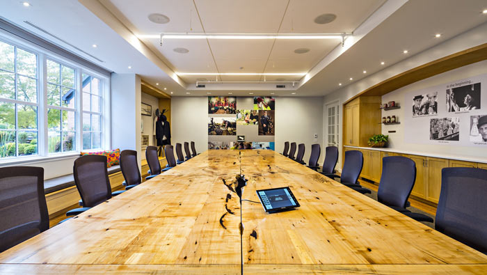 辦公會(huì)議室裝修效果圖:由顏色框定的會(huì)議空間,正是設(shè)計(jì)師為企業(yè)專門(mén)定制的,這樣可以減少隔墻對(duì)空間的影響,斜放的會(huì)議桌椅,讓空間不會(huì)那么呆板。