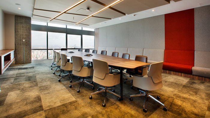 會(huì)議室設(shè)計(jì)方案:空間可以容納將近30個(gè)人,會(huì)議桌可以容納16個(gè)人,邊緣沙發(fā)可以容納十幾個(gè)人,設(shè)計(jì)師要做的就是在滿足企業(yè)需求的同時(shí),將空間開發(fā)到最大化。