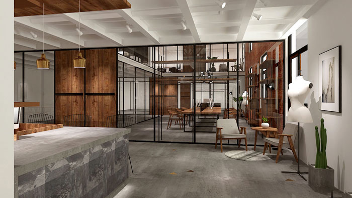 在廠房辦公室前臺的設計過程中,設計師采用工業(yè)風+極簡的兩種設計風格對空間進行設計,在設計的同時設計師將空間融入企業(yè)的里面與文化,以此完成空間與空間的搭配,空間與企業(yè)的搭配。