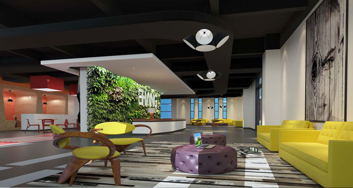 1500平方創(chuàng)意工廠辦公室前臺:在設計的時候,設計師采用公園式對空間進行設計,一方面這樣的空間不僅可以做前臺之用,同時還可以兼顧洽談、散步、休息、接待之用,設計師希望空間的作用可以發(fā)揮到極致。